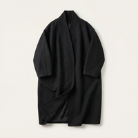 This women’s long overcoat features a full-length design with a stand collar and batwing-style sleeves. It is intended for use as an outer layer in cooler conditions.