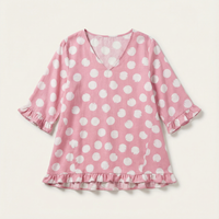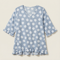This women’s polka dot top features a V-neckline, three-quarter sleeves, and a ruffle hem, designed for everyday or casual wear.